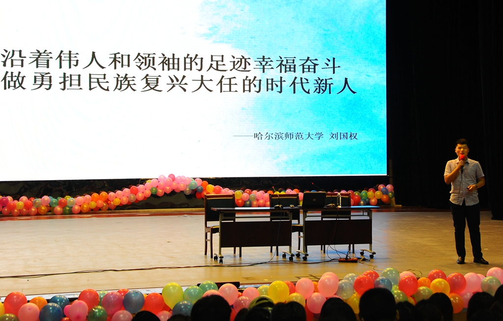刘国权作了题为《沿着伟人和领袖的足迹幸福奋斗 做勇担民族复兴大任的时代新人》的报告,报告共分走近“伟人”马克思、走近“领袖”习近平、用奋斗成就幸福、用中国梦激扬青春梦、做时代新人五部分,他勉励台下同学们要认识新使命、学用新思想、把握新形势、进行新奋斗,在新时代做合格的新青年。