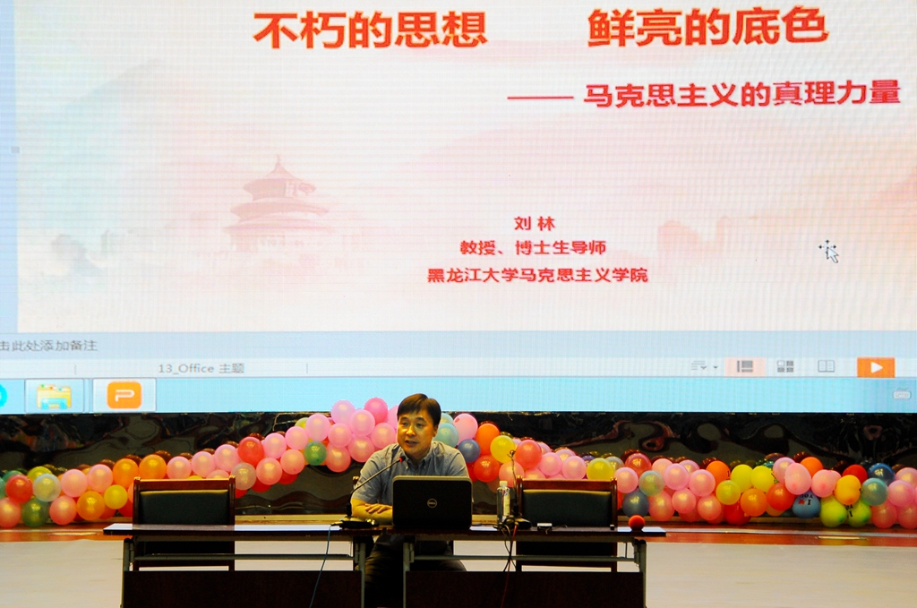 会上,刘林以《不朽的思想鲜亮的底色——马克思主义与新时代》为题,从“深入学习习近平总书记在北京大学师生座谈会上的讲话精神”、“认真领会习近平总书记‘纪念马克思诞辰200周年’讲话内涵”、“马克思主义是不朽的思想,是人类历史的伟大成就”、“马克思主义是中国特色社会主义的鲜亮底色”和“坚定理想信仰,感悟真理力量,用好强大思想武器”等五个方面,对习近平总书记在北京大学师生座谈会和纪念马克思诞辰200周年大会上的重要讲话精神作了深刻的阐释。