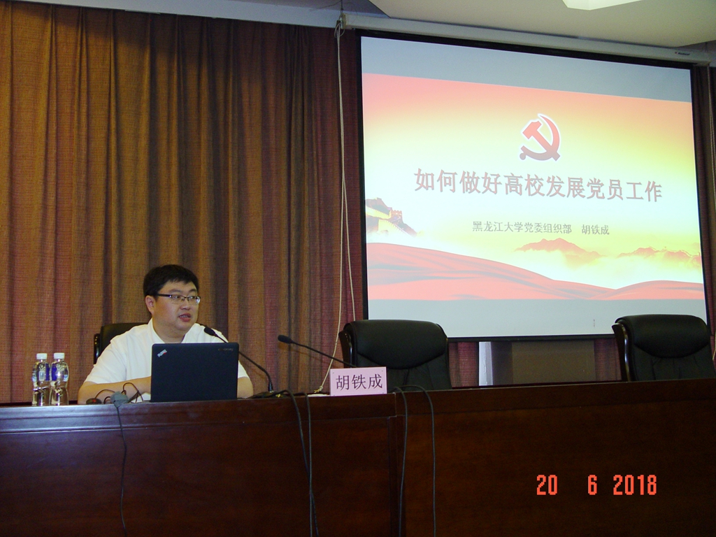 继6月19日的集中授课和现场教学后,20日上午,黑龙江大学党委组织部副部长胡铁成为轮训班学员作了题为《如何做好高校发展党员工作》的业务知识专题辅导讲座,讲座包括规范发展党员工作的重要意义、发展党员工作的制度遵循、党支部和党支部书记发展党员工作职责、发展党员工作具体流程等四部分内容。