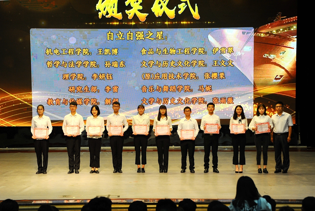 校园之星代表、自立自强之星获得者、食品与生物工程学院伊雪翠同学代表全体获奖同学上台发言。