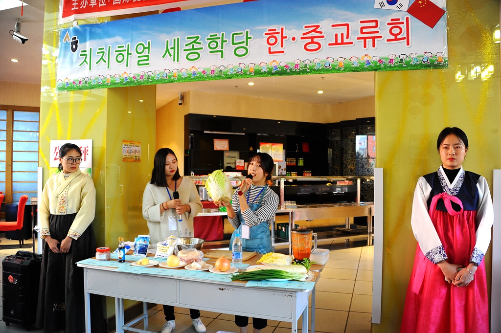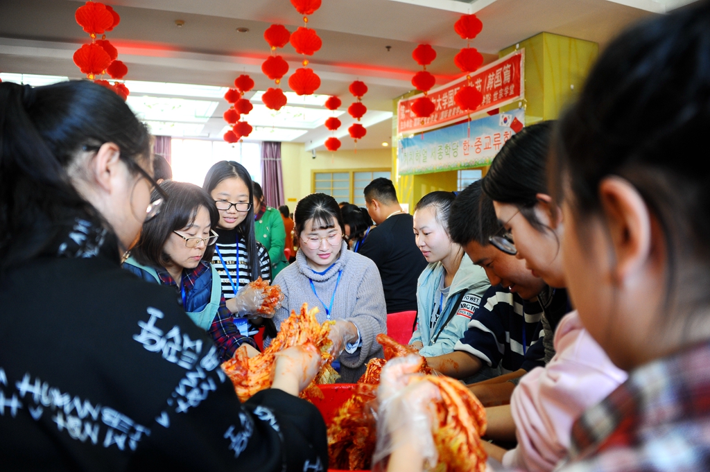 此次活动以韩国传统美食“泡菜”为主题,由韩国教师详细讲解演示泡菜的制作过程。师生们亲自动手制作泡菜,并与打糕等韩国传统美食一起品尝,活动现场气氛热烈。