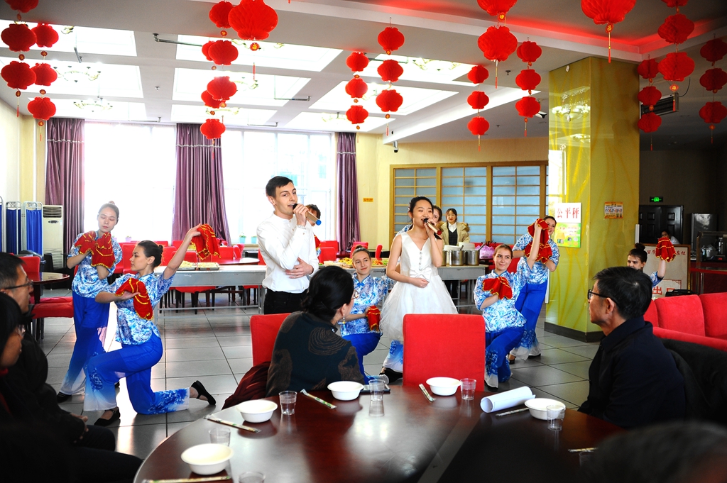 在极具中国风的民歌《采红菱》伴奏下,身着中国民族服装的俄罗斯留学生和中国学生翩翩起舞,向来宾表达敬意。
