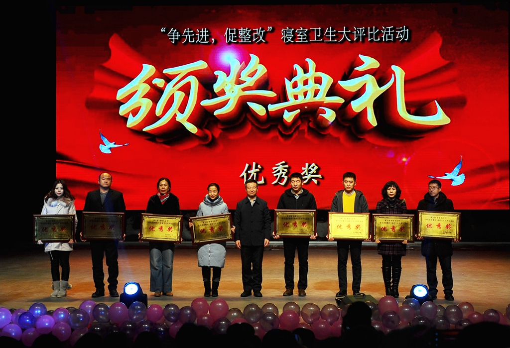 在晚会期间,同时举行了第五届“寝室文化节”系列活动颁奖仪式。以“公寓安全,我是第一关”为主题的门卫岗位大练兵活动优胜者、“我奉献,我快乐”为主题的“最美公寓人”获得者、“美丽公寓我的家”为主题的公寓公共区域装饰设计大赛获奖者及学院优秀组织奖代表、“争先进,促整改”寝室卫生大评比获得优秀奖的学院受到表彰,与会领导分别为各获奖代表颁发获奖证书或奖牌。
