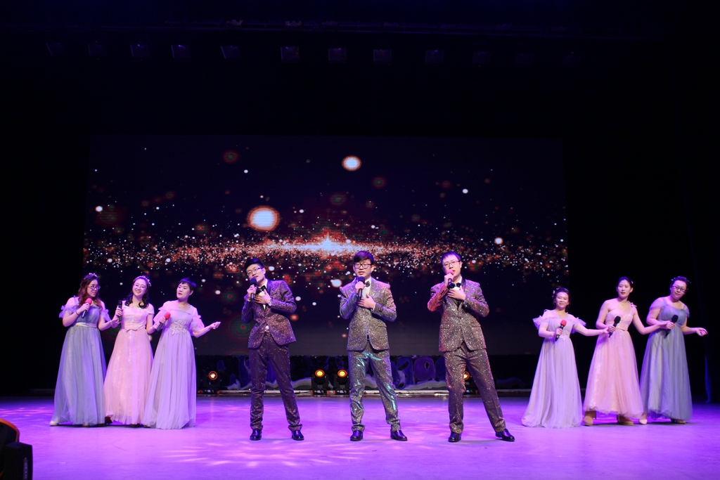 公共外语教研部张丹、肖长生等带来的英文歌曲联唱《Warm、The Day You Went Away、Auld Lang Syne》,伴随着熟悉的旋律响起,全场观众一起随音乐轻声哼唱,寻找着那些曾经的回忆。