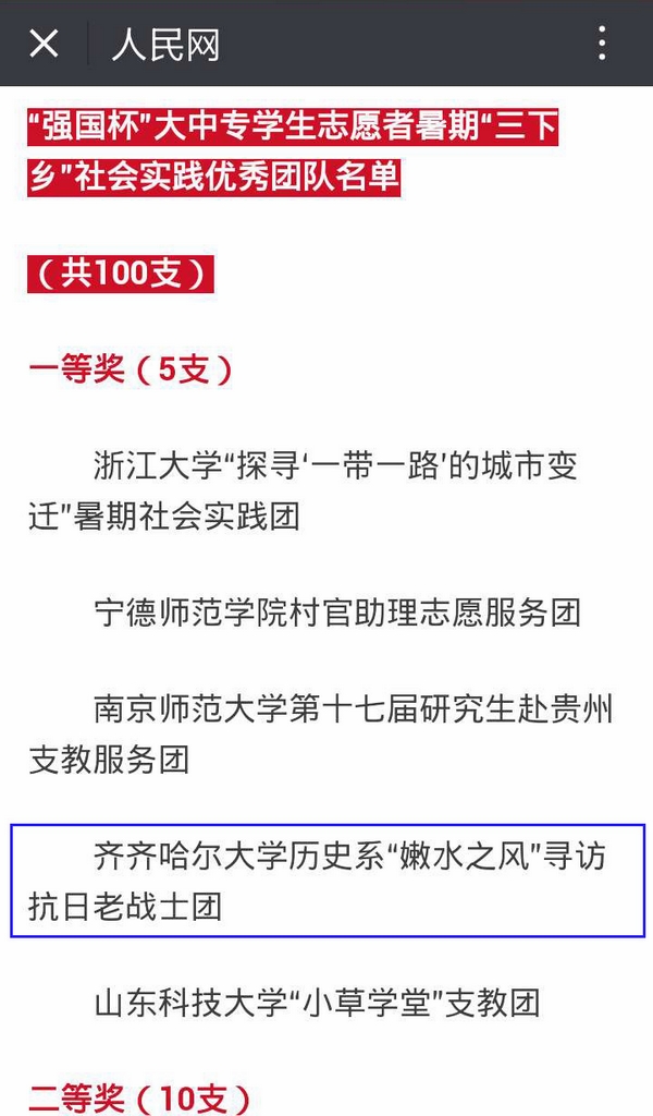 12月30日,人民网微信公众号发布了2015年“强国杯”大中专学生志愿者暑期“三下乡”社会实践优秀团队名单,beats365“嫩水之风”团队荣获一等奖。