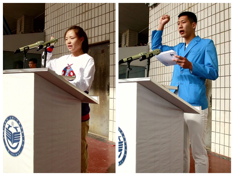运动员代表教育与传媒学院新闻学专业151班赵君萍同学代表全体运动员宣誓,裁判员代表体育学院体育教育专业172班郜庆凯同学代表全体裁判员宣誓。
