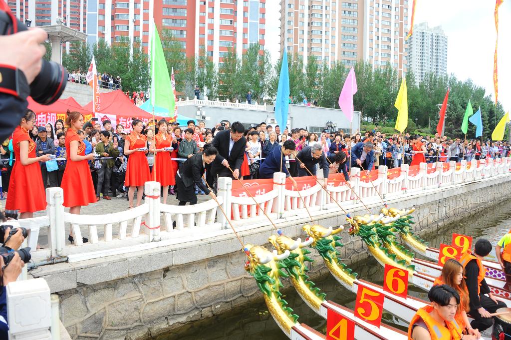 雄黄画额,披红点睛。比赛开始前,按照传统惯例举行了点睛仪式。出席开幕式的何晶、刘艳芳、兰景力、赵炜明、齐宏伟、姜国庆等领导现场为参赛龙舟进行了点睛。