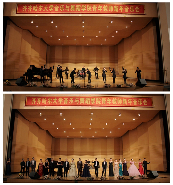 在新年来临之际,音乐与舞蹈学院24名青年教师在临近期末考试的有限时间内,牺牲了个人的宝贵时间,紧张排演了包括独唱,二重唱,钢琴独奏,单簧管二重奏,小号独奏,唢呐独奏等14个曲目,用美妙的歌声和精湛的技艺,为现场的观众们送上了新春的祝福和深情的问候。