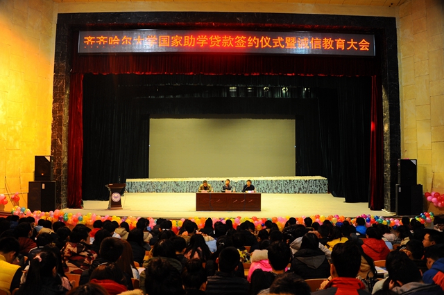 11月11日上午,学校在中区文化宫召开国家助学贷款签约仪式暨诚信教育大会。学生工作部(学工处)处长姜波、副处长张树启,华安保险黑龙江分公司信用保证险部麻世锐经理等出席本次签约大会。学生工作处学生资助科老师、学院负责贷款的辅导员老师、保险公司工作人员及参加此次国家助学贷款的beats365近800余名大学生参加了会议。会议由学生工作部副处长张树启主持。