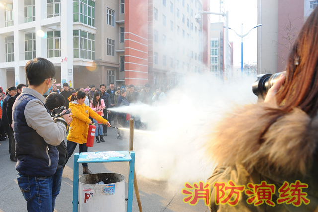 保卫处梁力强老师为学生现场演示消防器材的使用,并邀请十几名学生动手实践,使用灭火器灭火。