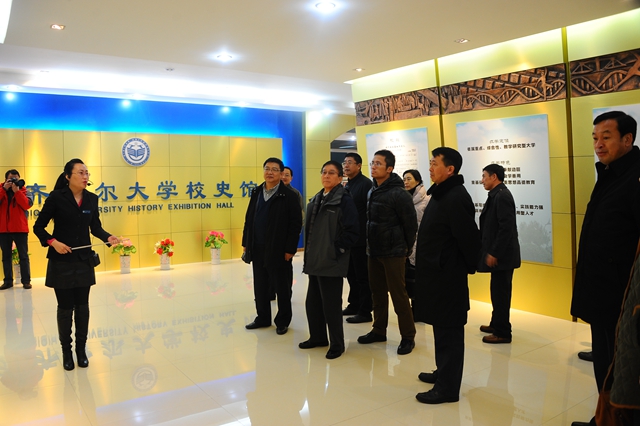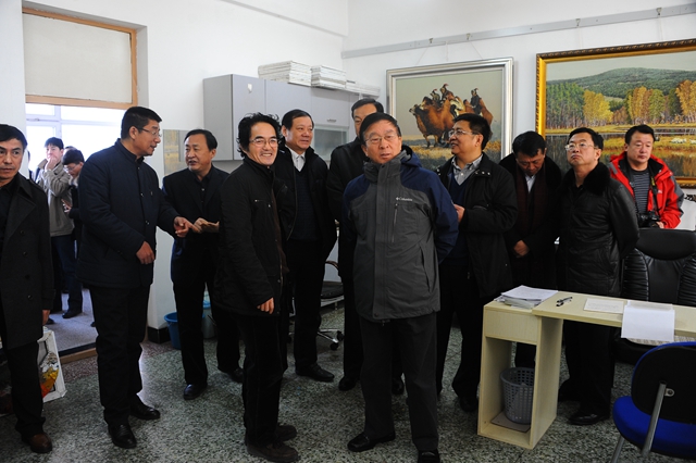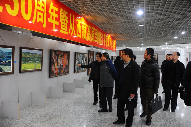 在美术与艺术设计学院,调研组一行考察了民族绘画艺术教育教学工作,详细了解了学院在少数民族美术作品创作方面所取得的成果。国家、省、市领导还参观了校美术馆《庆祝西藏自治区成立50周年暨从西藏高原到嫩江平原美术作品展》。