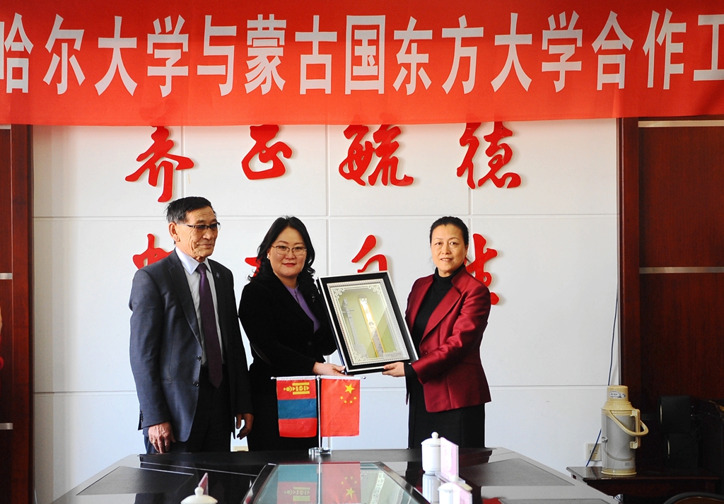 陈桂芝欢迎额·温都尔玛一行的到来,并与蒙古国高校来访客人互赠纪念品。