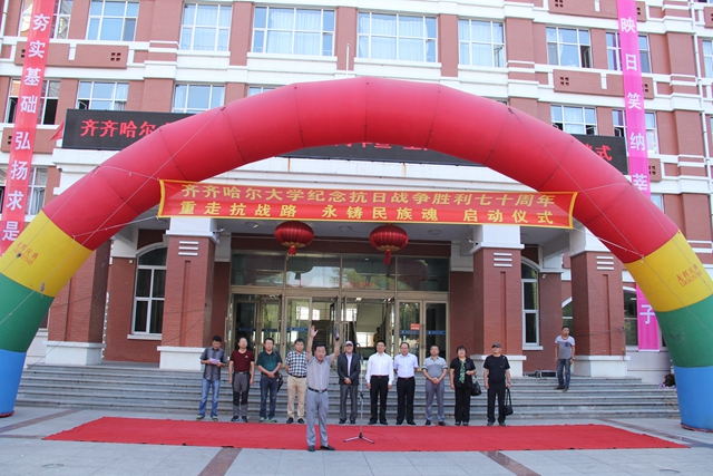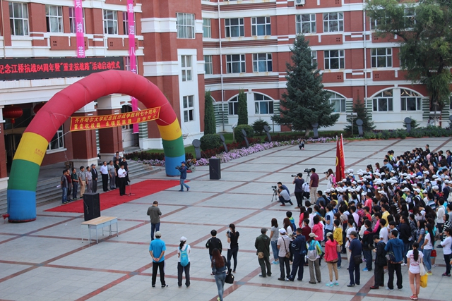校党委书记李海红在启动仪式上讲话。他说,今天,我们在这里举行一个隆重而庄严的仪式,为beats365唯一官方网站“重走抗战路”的百名师生出征壮行。同学们将沿着爱国将军马占山当年出征抗战的行军路线,步行到达打响中国军队武装抗日第一枪的地方——泰来县江桥镇,并以此纪念70年前那场伟大的民族胜利。