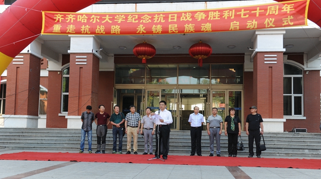 校党委书记李海红,党委副书记盖元臣,党委宣传统战部部长王晓梅,党委宣传统战部副部长孟宪国,党委宣传部副部长何强,文学与历史文化学院党委书记张振民,黑龙江省政府参事、原齐齐哈尔市政协副主席、江桥抗战研究会会长伊忠义,齐齐哈尔市委宣传部副部长覃华,齐齐哈尔市民革市委副主委、江桥抗战研究会副会长刘兴明,齐齐哈尔市社科院研究员、江桥抗战研究会秘书长孙文政等出席启动仪式。启动仪式由文学与历史文化学院副院长肖国栋主持。