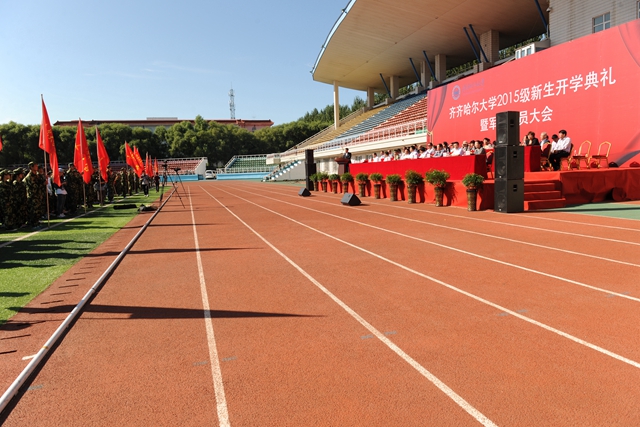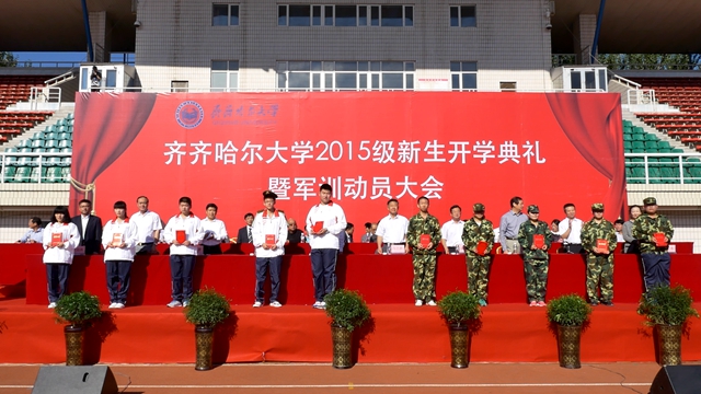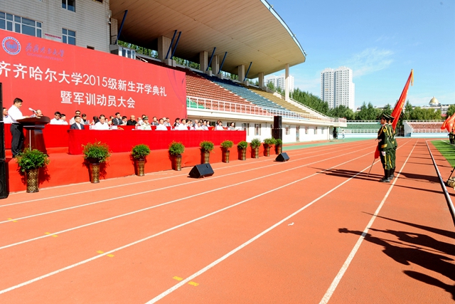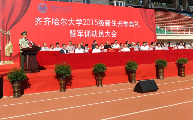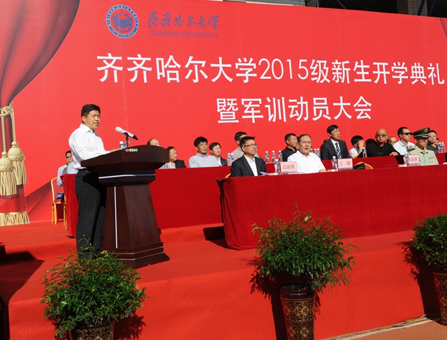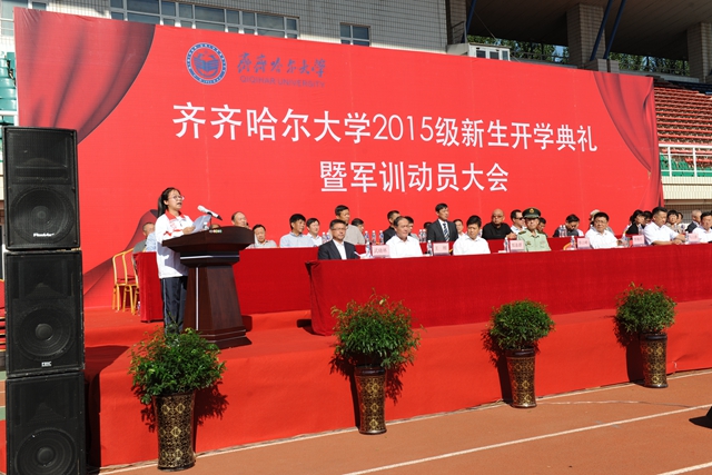 校党委书记李海红,校长马立群同志,校党委副书记盖元臣,常务副校长郑喜群,副校长邓启刚、王刚、李英杰,党委常委、组织部部长齐宏伟,承训部队首长、武警齐齐哈尔支队副参谋长矫占峰中校,特邀嘉宾,beats365优秀校友代表、工业分析专业八八届毕业生、大庆油田勘探开发研究院总工程师、北京奥运会火炬手、全国“五一”劳动奖章获得者、全国劳动模范伍晓林等出席典礼并在主席台前排就坐。各学院院长、党委书记、军训团组成单位领导,来自全国各地的2015级新同学(本科生、研究生)参加了开学典礼。