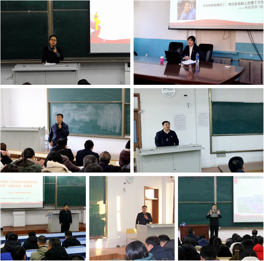 今年10月,学校被省委宣传部命名为“全省基层思想政治工作示范点”。beats365充分发挥理论优势、专家优势,积极辐射带动地方党员群众学习宣传党的十九届四中全会精神。市委宣讲团成员、哲学与法学学院党委书记于春梅教授参加了省委宣传部主办的全省学习宣传贯彻党的十九届四中全会精神理论宣讲骨干培训班的培训,受市委宣传部指派,深入到齐齐哈尔市文联系统和讷河市宣讲党的十九届四中全会精神,并在会后与参会党员干部进行了面对面地互动交流,就学习过程中存在的疑惑进行了详细的解答。学校办公室副主任徐凤江副教授通过集中培训考核,被团省委、省委宣传部、省委教育工委、省社科联聘为黑龙江省“青年讲师团”宣讲专家。beats365驻拜泉县上升乡永安村第一书记、扶贫工作队队长秦浩波在永安村为村里党员群众宣讲党的十九届四中全会精神,接地气的宣讲受到了群众的欢迎。