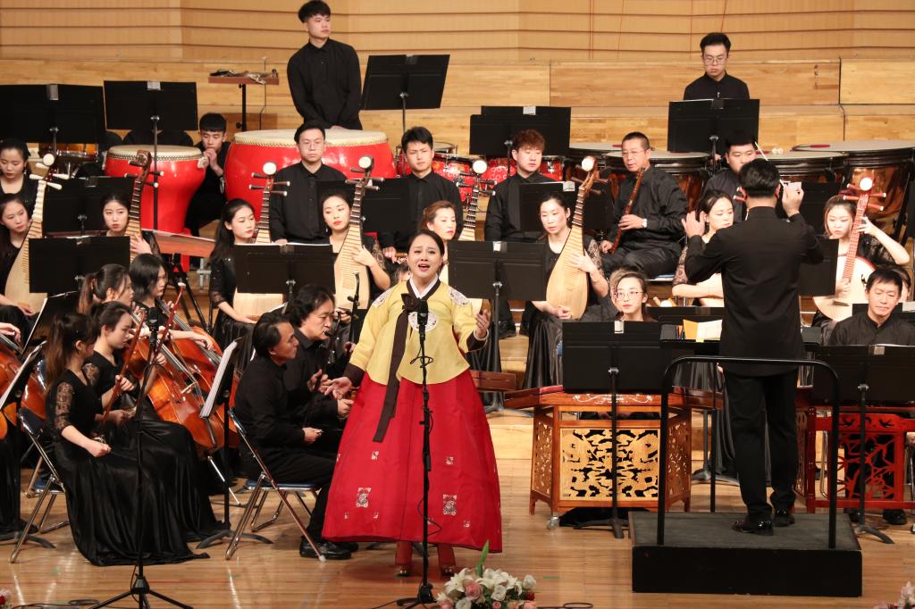 校民族管弦乐团演奏的《红高粱》,是由作曲家兰添根据电视连续剧《红高粱》的主题曲改编而成,乐曲充分表达了剧中人物的复杂情感。曲调时而激昂,似怒吼。时而轻柔,似低语。用音乐诠释了生命的顽强,同时预示着生命的崛起,抗击的继续。
