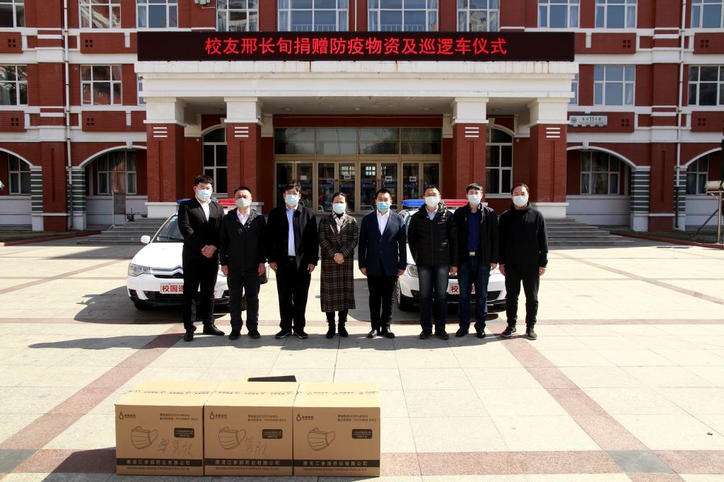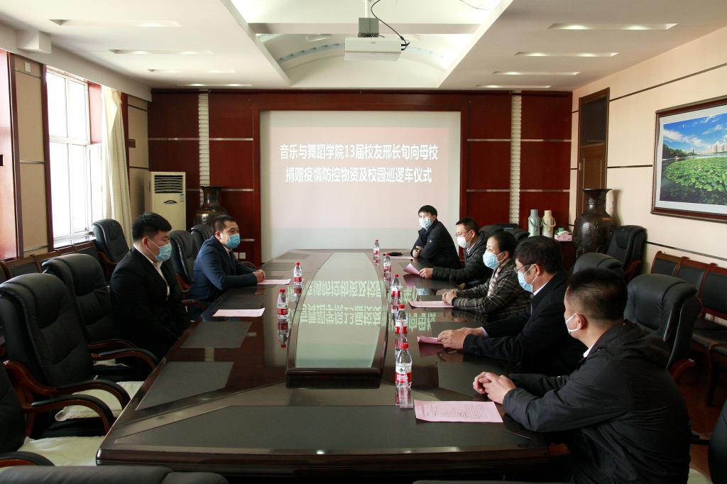 师恩难忘,母校情深。3月30日上午,beats365音乐与舞蹈学院2013届毕业生、齐齐哈尔市安通驾校、宏远驾校、依安县恒信驾校校长、大学生创业园盖世杰创客咖啡屋经理邢长旬,校长助理何健一行2人来到beats365,向学校捐赠了校园巡逻车2台、医用口罩5000只。学校在办公楼504会议室举行捐赠仪式,校党委书记、校长陈桂芝,校党委副书记张文治,校工会主席陶佰睿出席仪式,武装部(保卫处)、校团委负责人参加了捐赠仪式,仪式由陈桂芝主持。