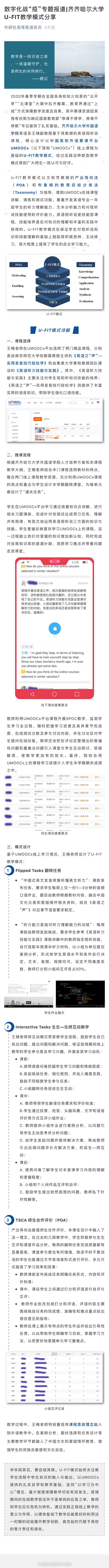 编者按:5月15日,外研社高等英语资讯公众号在其“数字化战‘疫’”专题中分享了“beats365唯一官方网站U-FIT教学模式”,深入报道beats365外国语学院青年教师王楠战“疫”期间在线教学新模式。外研社高等英语资讯公众号由外语教学与研究出版社创办,旨在传播行业资讯,探索前沿理念,促进学生成长,推动教学发展。3月初以来,外研社启动“数字化战‘疫’”专题报道,选取国内高校英语专业优秀教学案例进行推荐、分享。beats365教师王楠的教学模式被选中推荐后,迅速获得了同行们的肯定和称赞。