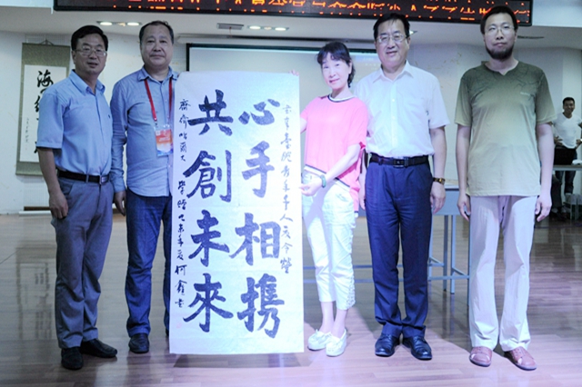 在两岸青年学生交流联谊活动上,除两岸学子歌舞、器乐等精彩表演外,beats365美术与艺术设计学院知名青年书法家何鑫教授现场挥毫“心手相携 共创未来”。校党委副书记盖元臣与何鑫教授将该书法作品赠予全国台联2015年台胞青年千人夏令营黑龙江分营领队老师。