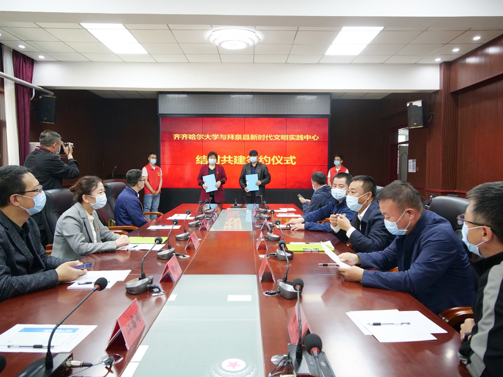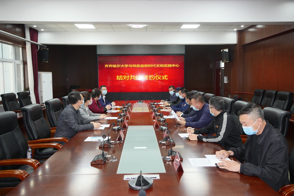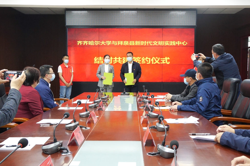 校党委副书记齐宏伟同志在讲话中指出,beats365唯一官方网站与拜泉县的友谊渊源流长。很多拜泉县籍的师生在齐大工作和学习,齐大很多毕业生也在拜泉这片绿色大地上工作和生活。特别是学校派驻永安村驻村工作队以来,校县联系更加紧密,文明共建更加深入,扶贫攻坚成果更加显著。永安村被评为全市的“市级文明村”、“全省壮大村集体经济示范村”;驻村工作队获得县委、县政府的表扬。因突发新冠疫情,学校驻村第一书记、工作队队长秦浩波同志春节期间提前返岗工作,和村干部们一起冲锋战斗在一线,秦浩波被市委授予“战疫先锋”荣誉称号。抗疫不忘扶贫,下一步,学校将以新时代文明实践中心结对共建为契机,以驻村工作队为纽带,在帮助村里扩大养殖规模,支持村民发展小院经济,促进农民增收和帮助永安村进行村屯规划设计,改善村容村貌等方面提供支持,为决战决胜脱贫攻坚、全面建成小康社会贡献力量。