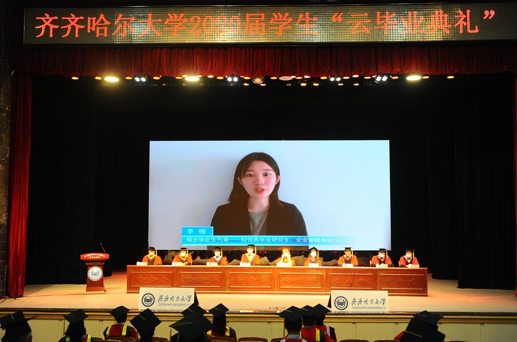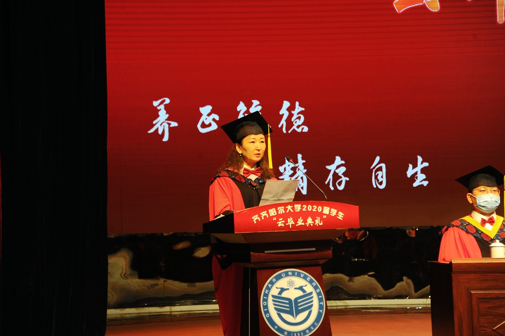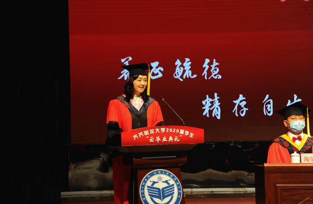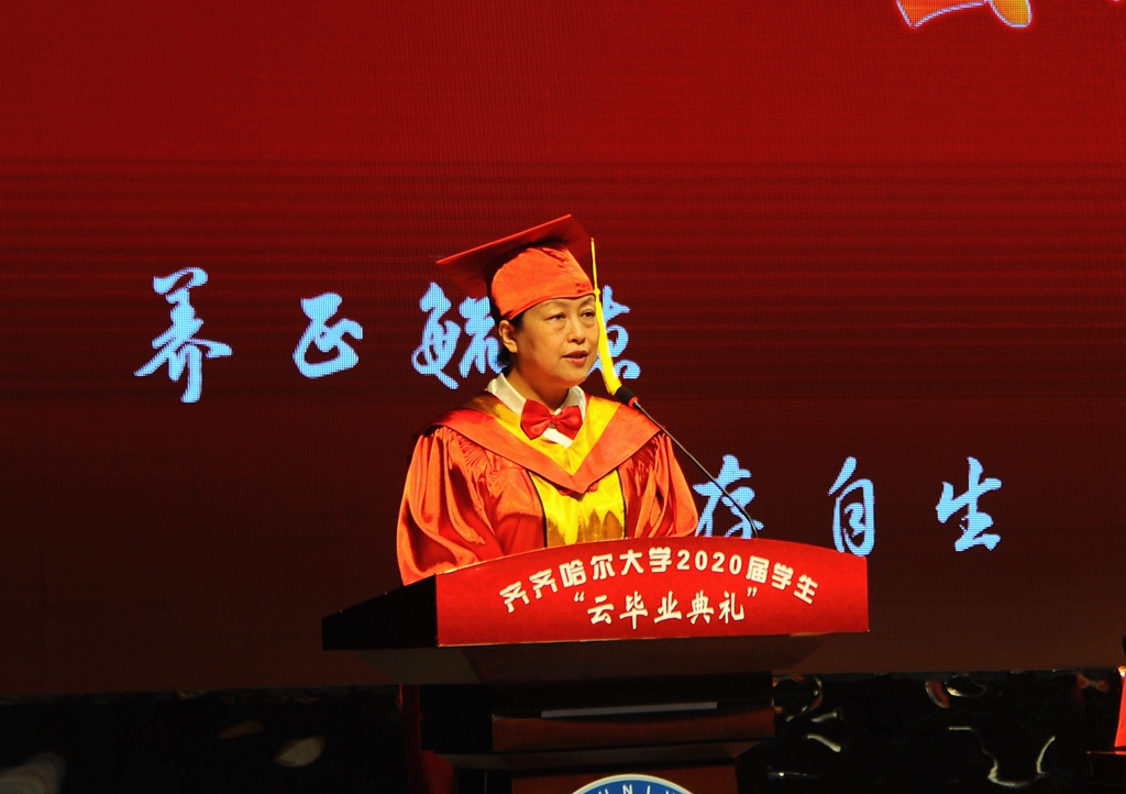 她说,阔别半年,母校终于又在美丽的劳动湖畔,以这样一种别开生面、千里一线的方式,与各位同学相聚,共祝毕业典礼。半年来,我们共同经历了一场来势凶猛、席卷全球的新冠肺炎疫情,共同面对着疫情影响下的各种担忧、困阻和损失,共同参与到波澜壮阔的全民战“疫”、人民战争之中,共同表现出我们齐大人“养正毓德、精存自生”的校训精神。特别是各位2020届毕业生同学,你们克服了疫情影响,圆满完成了学业,以各方面的优异表现,交上了一份完美的毕业答卷。你们是最美丽的齐大人!母校为你们点赞,老师向你们致敬!