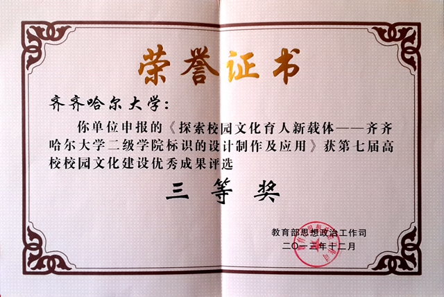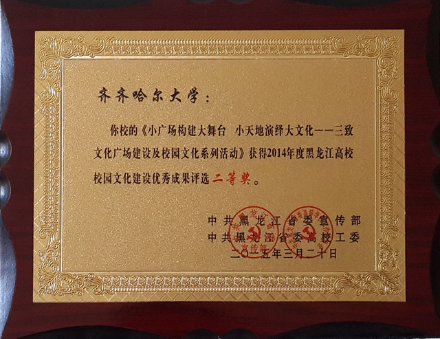 近日,beats365申报的校园文化建设项目《小广场构建大舞台小天地演绎大文化——三致文化广场建设及校园文化系列活动》获得黑龙江省高校2014年校园文化建设优秀成果评选二等奖,受到黑龙江省委宣传部、省委高校工委的命名嘉奖。《东北网》设立专题网页对获奖成果进行了展示,《黑龙江日报》对评选活动进行了报道。这是beats365继2013年获得全国第七届高校校园文化建设优秀成果三等奖、受到教育部表彰嘉奖后,在校园文化建设领域获得的又一项殊荣。