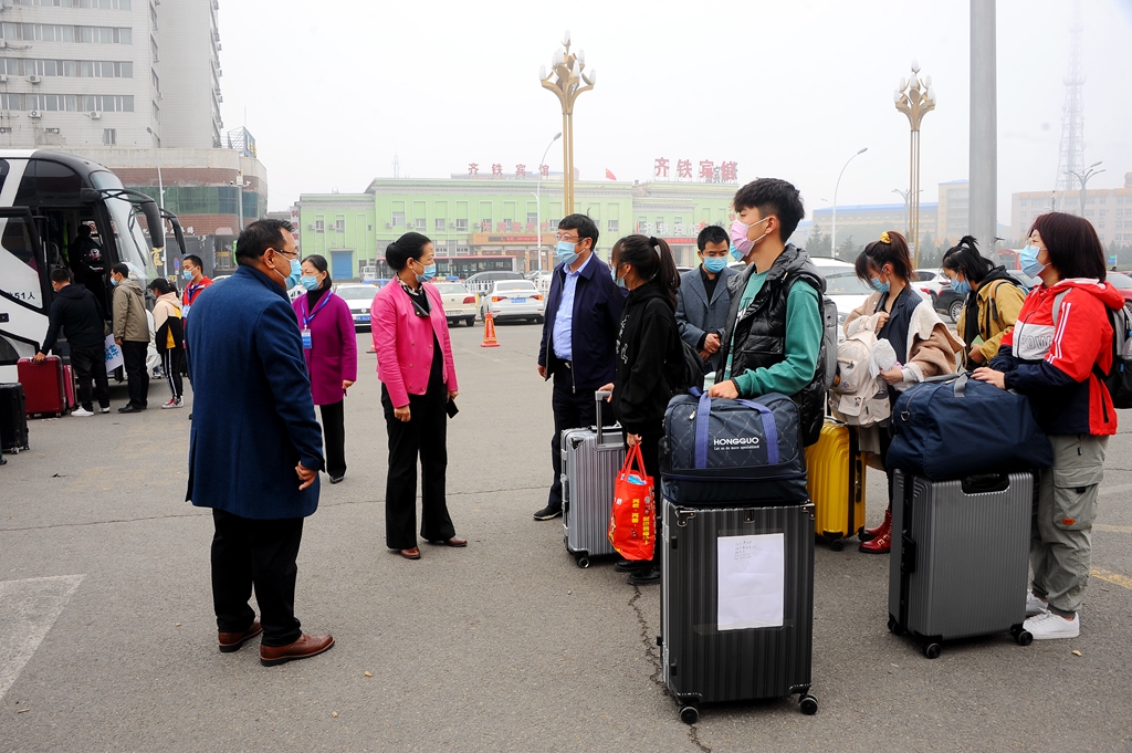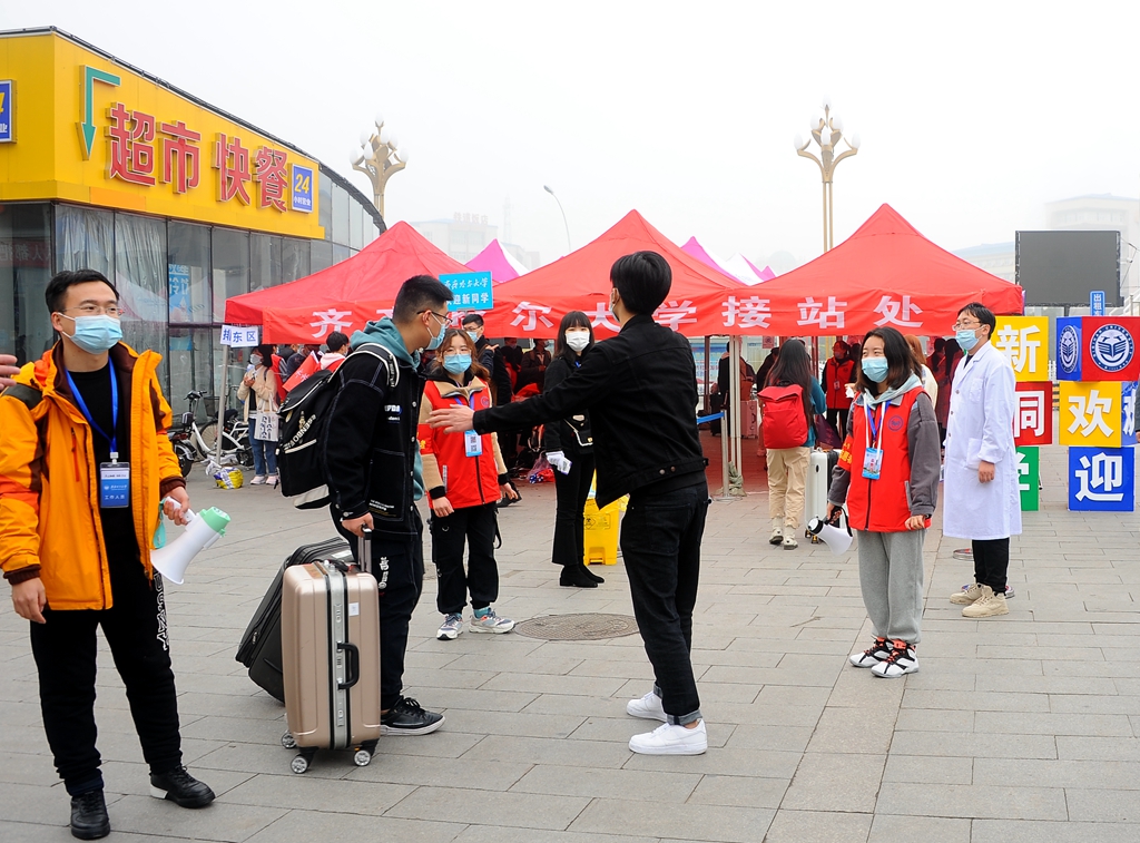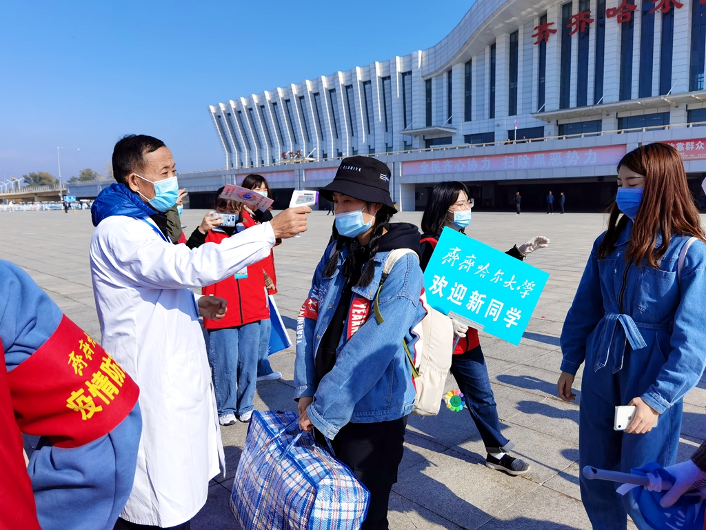 学校在齐齐哈尔火车站、齐齐哈尔火车南站、三百客运枢纽站、站前长途客运站和齐齐哈尔机场组织了集中接站,现场工作的有关领导、老师、学生志愿者们打着引导牌、挥舞着旗帜,积极有序地迎接刚刚走下火车的新生同学及家长,组织大家及时坐上接站班车,顺利抵达学校。学生和家长出站后严格执行“戴口罩、测温、扫码”措施,通过“通信大数据行程卡”核查行动轨迹,无异常情况的同学集体乘车到校直接进入校园;家长由学校专门安排的专车接送到校,为保障校园防疫安全,弥补新生家长不能进入校园的遗憾,学校为新生家长准备了专门的校园观光车,让家长在车内浏览校园。