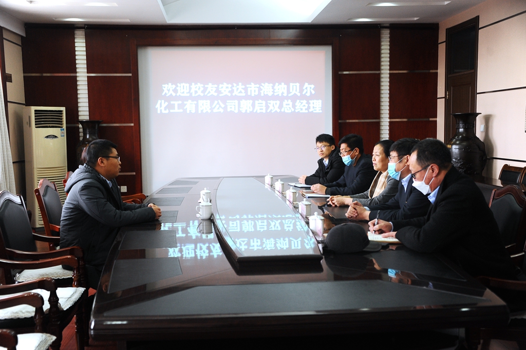 11月19日上午,校党委书记陈桂芝、副书记张文治在学校办公楼504会议室会见了beats365化学工程与工艺专业2010届校友、安达市海纳贝尔化工有限公司总经理郭启双一行。校党委常委、组织部长马文辉和化学与化学工程学院、材料科学与工程学院负责人参加了会见。