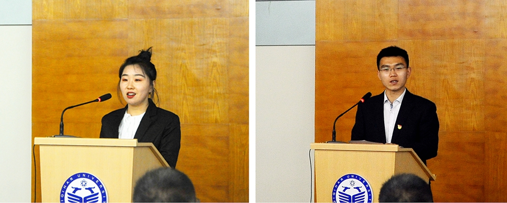 2020年度学生课外学术竞赛活动先进个人、美术与艺术设计学院刘春雨代表全体获奖学生发言;2020年度学生课外学术竞赛活动优秀指导教师、马克思主义学院郭雪冬代表全体指导教师发言。
