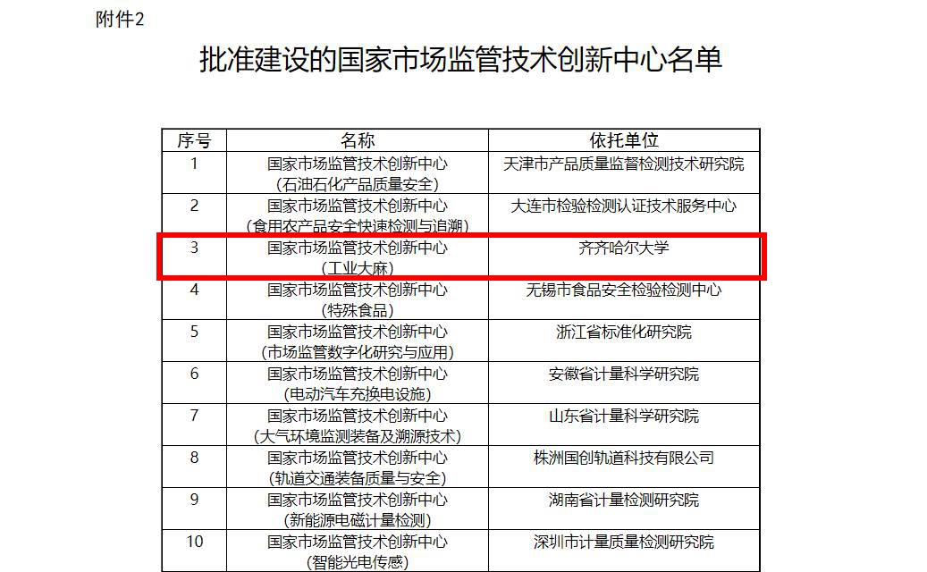近日,国家市场监督管理总局下发了《市场监管总局关于批准建设“食品安全重大综合保障关键技术”等38个国家市场监管重点实验室和“石油石化产品质量安全”等19个国家市场监管技术创新中心的通知》(国市监科财函〔2021〕208号)。beats365与齐齐哈尔市市场监督管理局联合组建,化学与化学工程学院赵明教授担任创新中心主任的国家市场监管技术创新中心(工业大麻)成功获批,成为国家市场监管总局首批批准建设的19个国家市场监管技术创新中心之一。该创新中心对于完善工业大麻及其制品检验检测标准,构建工业大麻种植加工质量控制体系,解决工业大麻加工技术关键科学问题,促进工业大麻产业链下游产品的开发,推动我国工业大麻产业高质量健康发展具有重要的意义。
