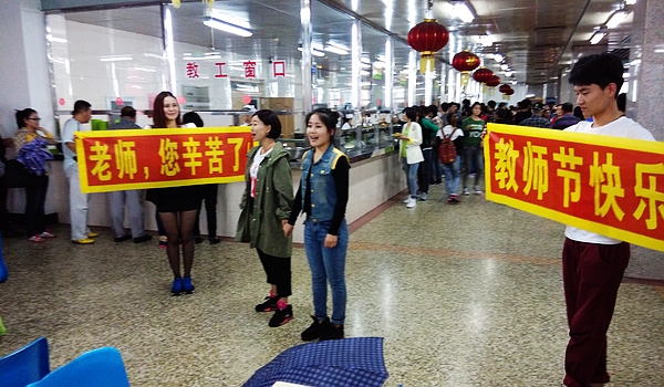 观众正议论,场上已换人,两个女生手拉手唱起了“长大后我就成了你”。在两首歌曲的演唱过程中,还有学生在现场打出“老师,您辛苦了”和“教师节快乐”两个条幅。
