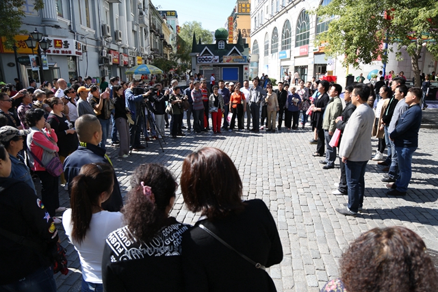 在哈尔滨中央大街金安商城、艺汇家商业广场、国润家饰城,齐大快闪团第一组表演了爱国歌曲《松花江上》。