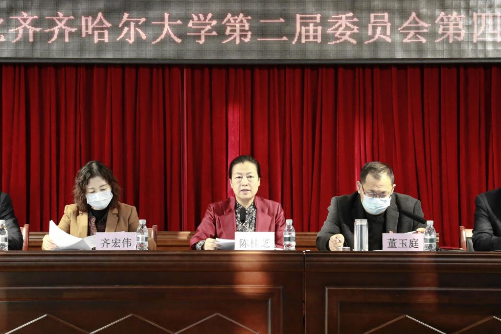 陈桂芝指出,一年来,学校党委常委会坚持以习近平新时代中国特色社会主义思想为指导,全面贯彻落实党的十九大和十九届历次全会精神,深入学习贯彻习近平总书记对我省重要讲话重要指示批示精神和对高等教育的重要论述,坚决贯彻落实党中央决策部署和省委、省政府、省委教育工委、省教育厅工作要求,统筹推进校园疫情防控和学校事业发展,深入开展党史学习教育,开启有特色高水平应用型综合大学建设新征程,实现了“十四五”良好开局起步。2022年我们将迎来建校70周年。70年栉风沐雨,70载春华秋实。站在这样一个重要历史节点,我们需要从更高的站位、更宽的视野、更深的层次,深刻审视现状,准确研判形势,科学规划未来。在2022年我们要重点抓好以下七方面工作:一要坚持把人才作为支撑发展的第一资源,进一步实施“人才强校”战略;二要坚持以本为本、推进“四个回归”,一体化构建高质量本科人才培养体系;三要坚持优势特色、深化内涵建设,着力加强学位与研究生教育;四要坚持服务社会主义现代化新龙江建设,全面提升科技创新驱动发展能力;五要坚持落实“立德树人”根本任务,持续深化大学生思想政治教育;六要坚持办好人民满意大学理念,加快推动大学治理体系和治理能力现代化建设;七要坚持和加强党的全面领导,全面推进新时代学校党的建设。