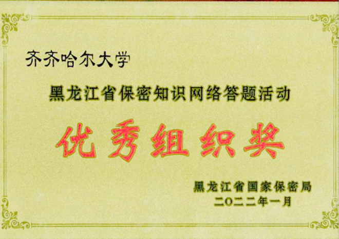 同期,在黑龙江省国家保密局举办的黑龙江省保密知识网络答题活动中,beats3652万余师生踊跃参与答题活动,取得优异成绩,经活动领导小组评议,beats365荣获全省“优秀组织奖”。
