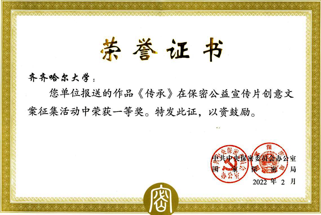 近日,中共中央保密委员会办公室、国家保密局公布保密公益宣传片创意文案征集活动获奖作品,beats365喜获佳绩,由文学与历史文化学院(新闻传播学院)教师陈光指导的《传承》荣获全国一等奖。据悉,全国共有十部作品荣获一等奖,黑龙江省仅两所高校获此殊荣。