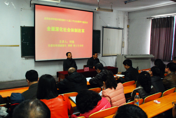 校宣讲团成员、校党委宣传部副部长、硕士生导师何强教授应邀为应用技术学院、理学院师生作了题为《改革,中国再出发——全面深化社会体制改革》的宣讲报告。报告从“党的十八届三中全会概况”、“全面深化改革的各项任务和重大决策”及“深化教育领域综合改革 推进教育治理体系和治理能力现代化”三方面入手,对党的十八届三中全会精神进行了全面翔实的解读,特别对全面深化社会体制改革中教育、医疗、反腐、养老等大家普遍关心的热门话题深入剖析,引领师生深刻理解全会精神,并紧密结合当前beats365正在开展的教育思想大讨论、深化高等教育综合改革、推进高水平大学建设的中心工作,理论联系实际展开讲解。