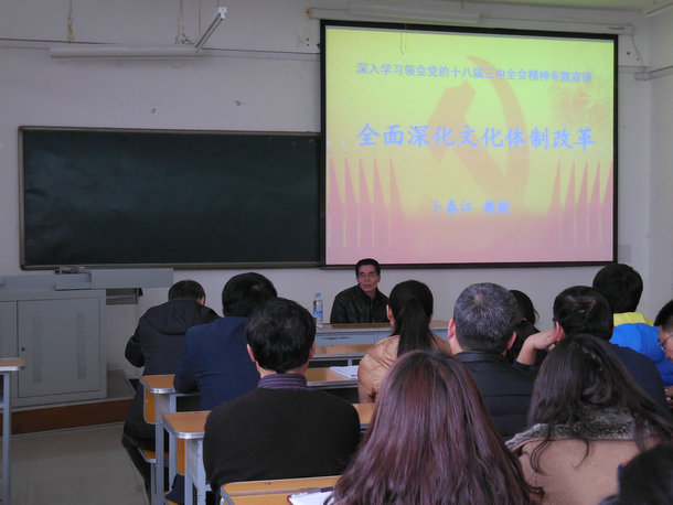 校宣讲团成员、经济与管理学院党委书记、硕士生导师卜春江副教授应邀为生命科学与农林学院、食品与生物工程学院、计算中心作了题为《全面深化文化体制改革》的专题报告。他从“为什么提出进一步深化文化体制改革”,“为什么提出建设文化强国”以及“高校如何在文化建设中提升贡献率”等三个方面对文化体制改革进行了详实的阐述,报告引经据典,深入浅出。并结合beats365实际,指出大学应该发挥在文化建设中的优势和基础作用,引领文化理念的更新,探寻文化铸校的路径,在提升文化软实力中做出自己应有的贡献。