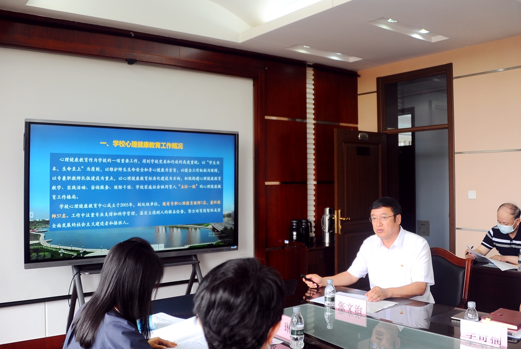 张文治代表学校向专家组汇报了学校心理健康教育工作概况、工作体制机制、工作队伍保障、工作条件保障、教育教学体系、实践活动体系、咨询服务体系、预防干预体系、协同育人体系、示范效应和工作特色亮点等内容。