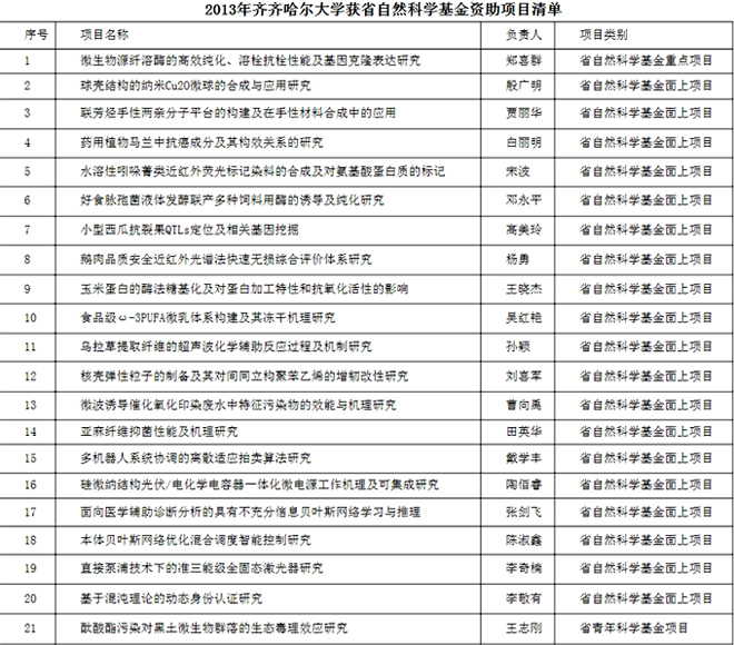 日前,2013年黑龙江省自然科学基金项目评审结果揭晓,beats365获省自然科学基金资助项目继续保持了良好的发展态势,共获得资助项目21项,其中面上项目19项,青年科学基金项目1项,重点项目1项;资助经费总额120万元,获批项目数量和资助金额都是beats365历年来最多的一年。其中郑喜群教授获得1项省自然科学基金重点项目,是继2011年以来beats365获批的第2项省自然科学基金重点项目。