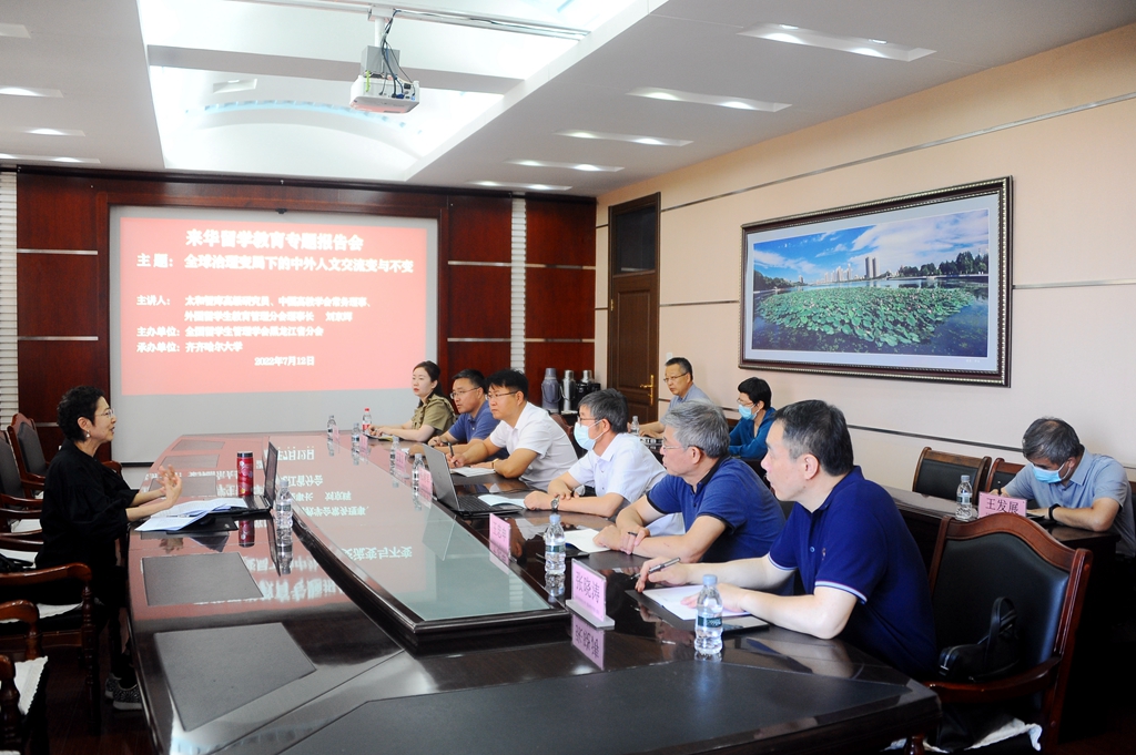 7月12日上午,太和智库高级研究员、中国高教学会常务理事、中国高教学会外国留学生教育管理分会理事长刘京辉在beats365办公楼504会议室作了来华留学生教育专题报告会。本次报告会由黑龙江省外国留学生教育管理分会举办,beats365承办,采用先线上线下相结合的方式进行。