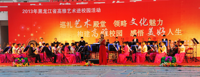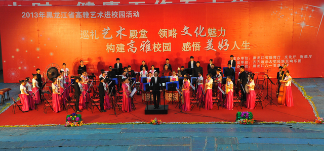 在大庆师范学院大学生活动中心为1000余名师生献上了一场精彩纷呈的民族交响艺术盛宴,使民族管弦乐队在韵律、表现力及民族音乐的普及上融入和赋予了更多的现代时尚气息。这场音乐盛宴,使大庆师院师生感受了民族交响音乐经典的独特魅力,感受到了高雅文化的强大精神力量。通过高雅艺术进校园活动,使同学们的艺术鉴别能力、艺术欣赏能力和审美素养得到了进一步提升。