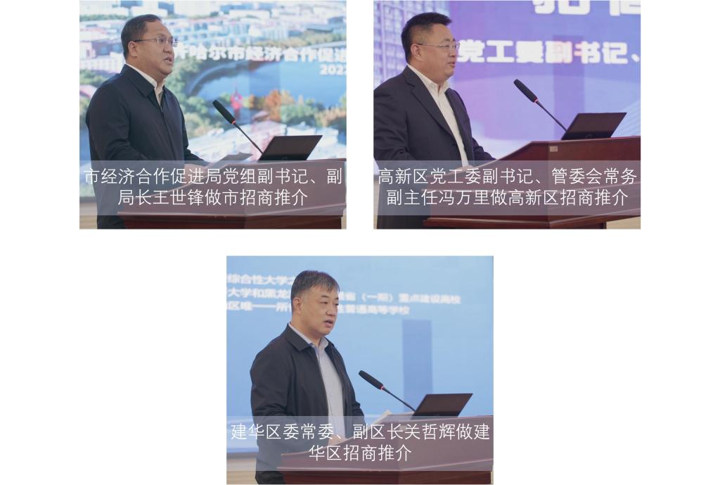 在齐齐哈尔市招商推介环节,市经济合作促进局、高新区、建华区政府相关负责人分别进行了招商推介。