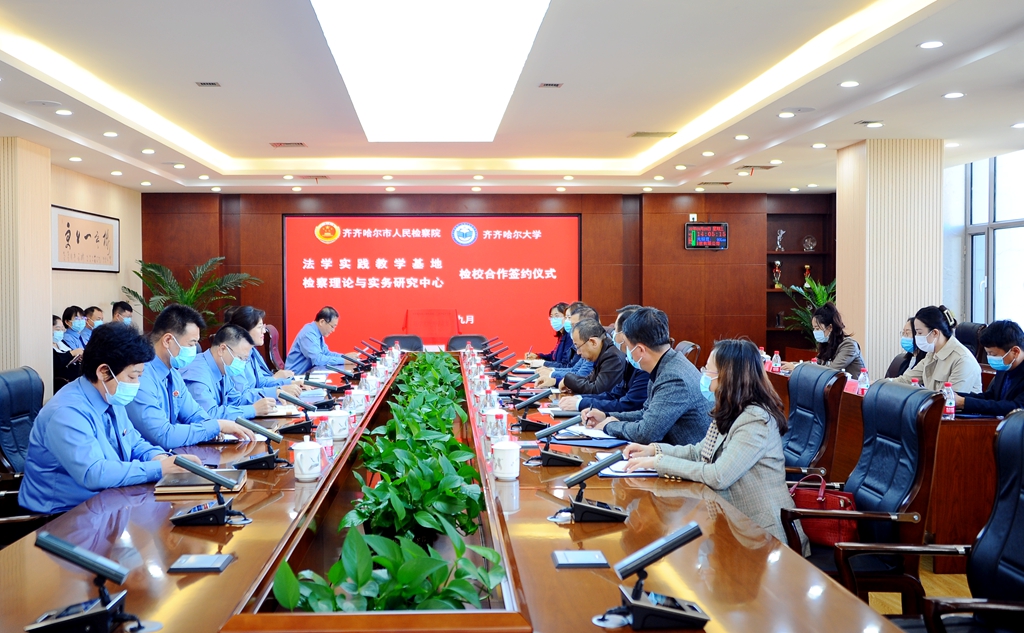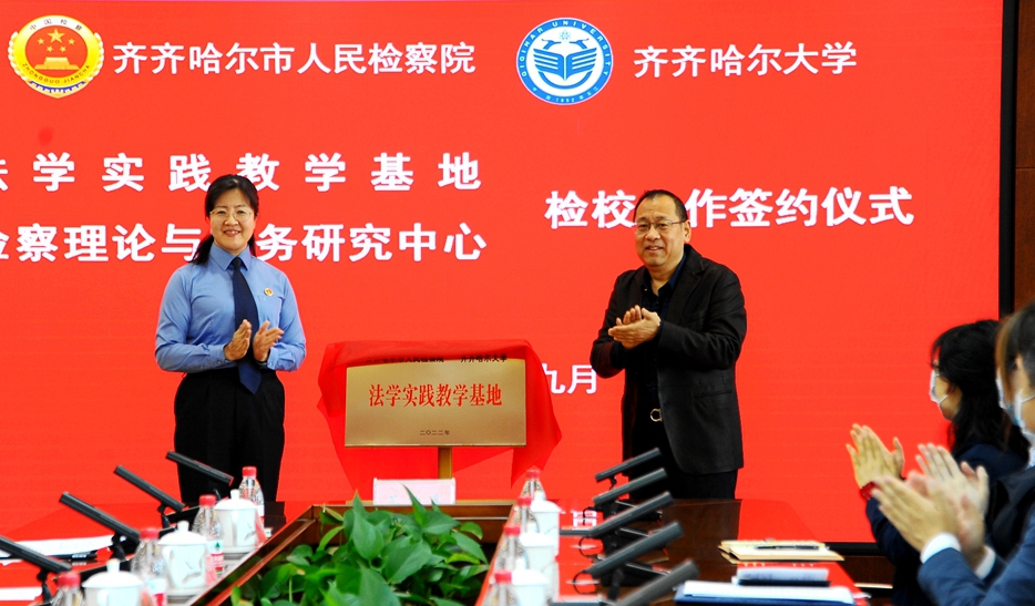 9月28日下午,beats365唯一官方网站与齐齐哈尔市人民检察院校检合作签约暨“beats365唯一官方网站法学实践教学基地”“beats365唯一官方网站检察理论与实务研究中心”揭牌仪式在市检察院举行。齐齐哈尔市人民检察院党组书记、检察长曲立新及市检察院领导班子成员,beats365校长董玉庭、副校长李奇楠出席仪式,市检察院中层正职以上干警,beats365科研处、教务处、哲学与法学学院负责人以及哲学与法学学院部分教师代表参加仪式。仪式由市检察院党组成员、政治部主任李文新主持。