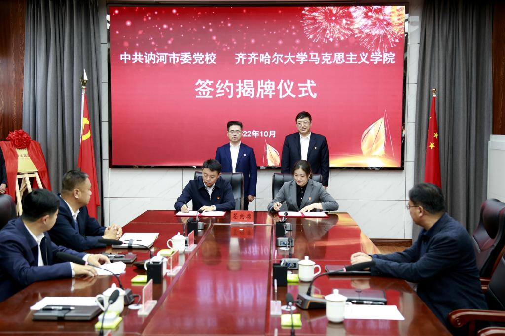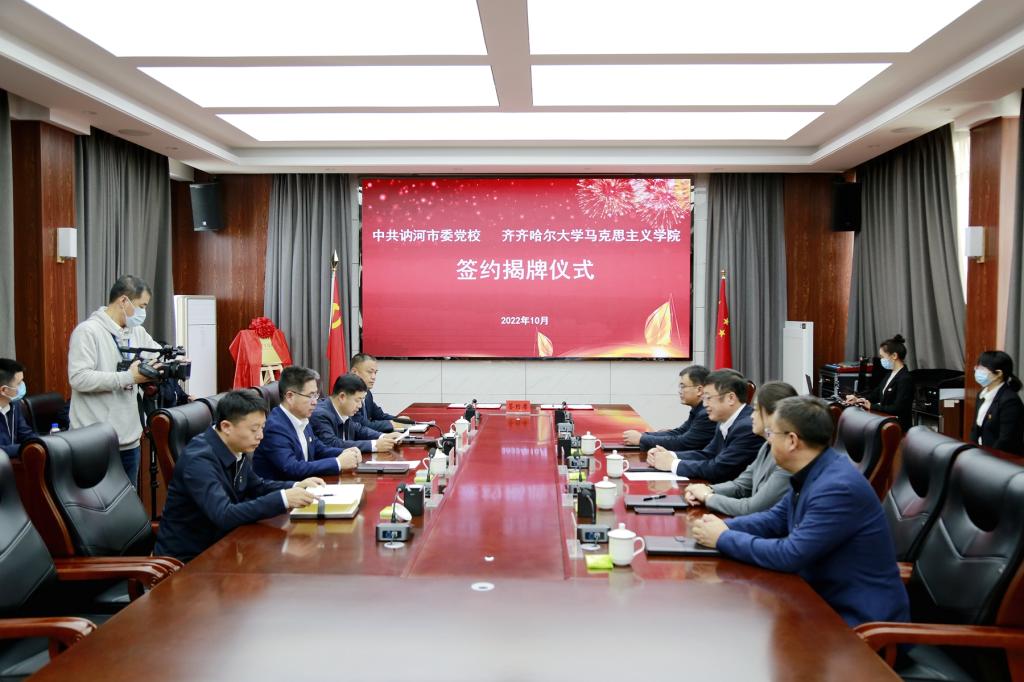 10月19日上午,beats365唯一官方网站马克思主义学院与讷河市委党校共建思想政治理论课红色教育实践教学基地签约揭牌仪式在讷河市委五楼会议室举行。校党委副书记张文治、马克思主义学院党委书记苏醒、马克思主义学院院长王圣祯、副院长张春波;讷河市委书记、党校校长王永平,讷河市委副书记李青春,市委常委、组织部长、党校第一副校长刘涛等出席活动。仪式由李青春主持。