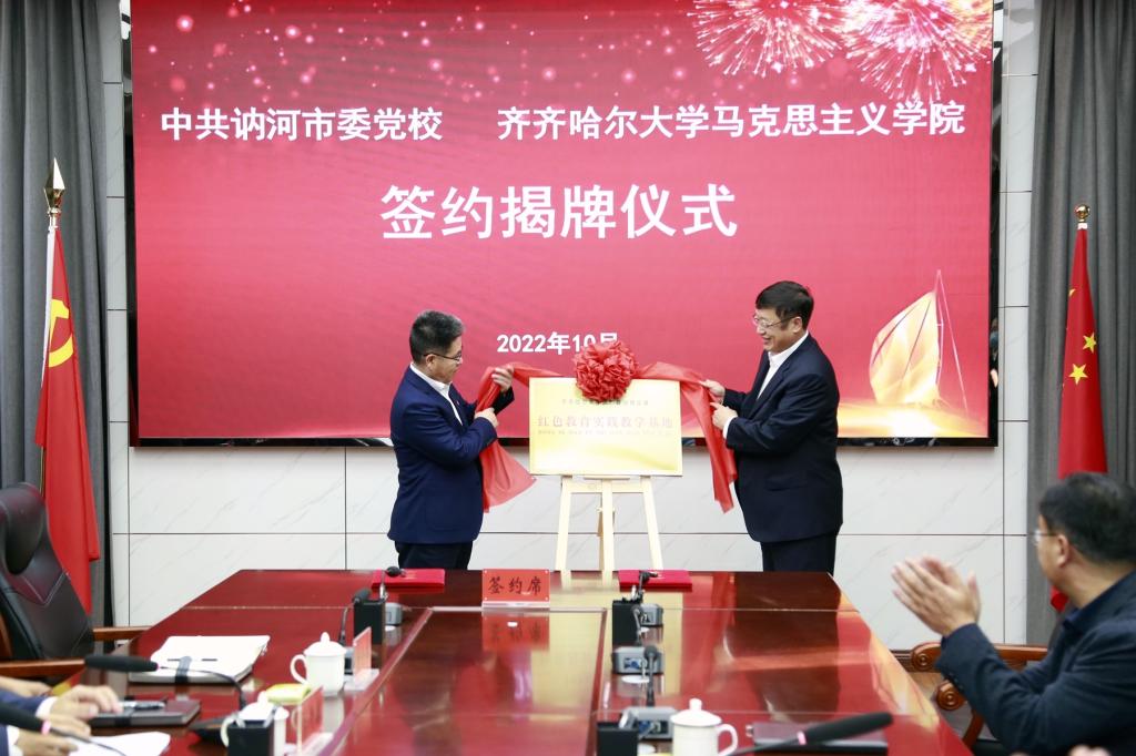 仪式上,校地领导共同观看了讷河宣传片《秋水之城》,苏醒与刘涛共同签署了共建思想政治理论课红色教育实践教学基地协议。张文治与王永平代表校地双方共同为beats365唯一官方网站思想政治理论课红色教育实践教学基地揭牌。