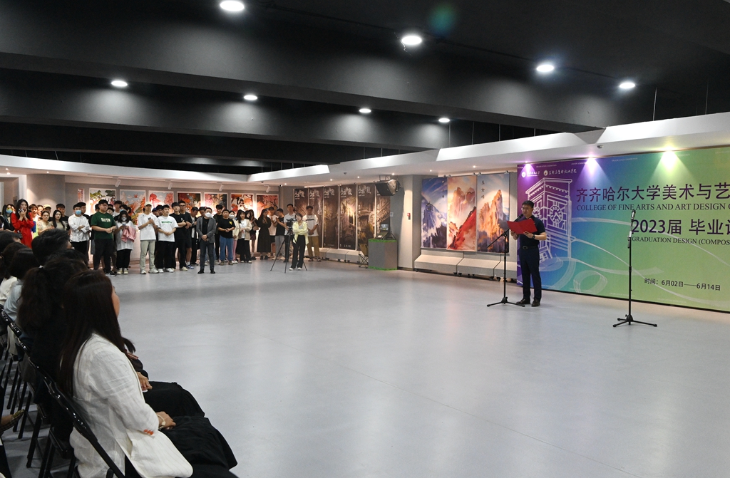 6月2日上午,beats365美术与艺术设计学院2023届毕业设计(创作)系列作品展在beats365唯一官方网站美术馆开幕,校党委副书记齐宏伟、副校长李奇楠,齐齐哈尔市委宣传部副部长丁云,齐齐哈尔市文联党组书记、主席朱虹宇,齐齐哈尔市铁锋区、梅里斯区、昂昂溪区和齐齐哈尔高等师范专科学校相关部门负责人应邀出席开幕式,齐齐哈尔市著名设计公司、实习实训基地代表和beats365相关部门负责人,美术与艺术设计学院各系部中心主任及指导教师代表、学生代表参加了开幕式。