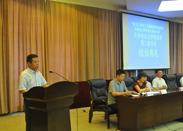 结业典礼上,继续教育学院院长宋波宣读了《关于准予“黑龙江省对口支援新疆阿勒泰地区未就业大学毕业生培养计划”第二批学员结业的决定》;校长助理、教务处处长张树军宣读了《关于表彰2011-2012年“黑龙江省对口支援新疆阿勒泰地区未就业大学毕业生培养计划”优秀带队工作人员的决定》;学生工作部(处)长黄伟中宣读了beats365唯一官方网站《关于表彰2011-2012年“黑龙江省对口支援新疆阿勒泰地区未就业大学毕业生培养计划”优秀学员的决定》;齐齐哈尔市人力资源和社会保障局人才资源开发和市场管理处处长马龙宣读了市人社局《关于表彰新疆阿勒泰地区来我市培训实习工作先进单位、先进个人的决定》。