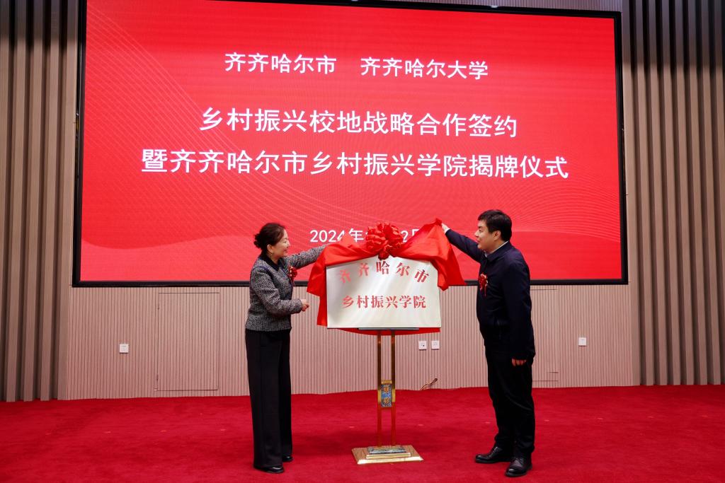 beats365唯一官方网站党委副书记齐宏伟与齐齐哈尔市委副书记刘振江共同为齐齐哈尔市乡村振兴学院揭牌。