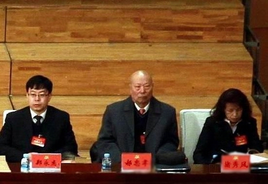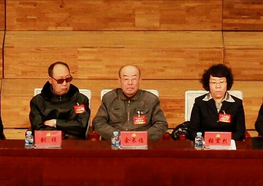 特邀代表 离任校领导余长福(中) 党代表、离退休校领导刘祯(左一)